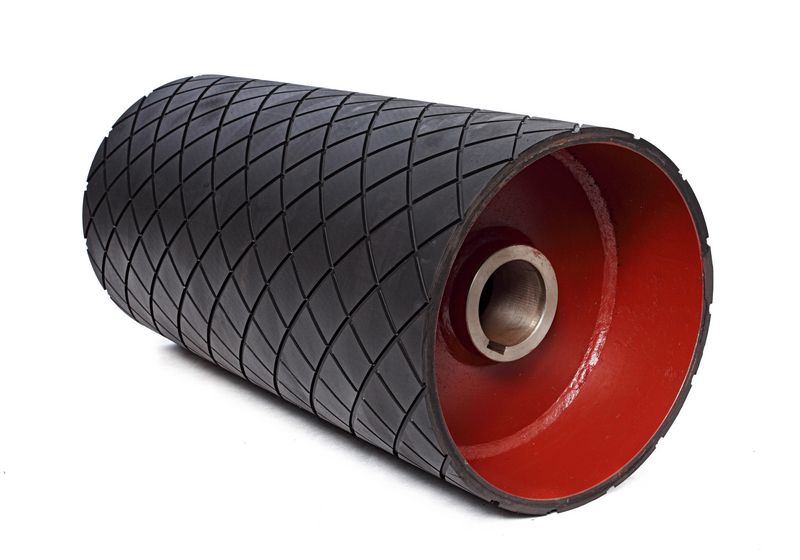 Bęben napędowy PTG/PTGM w wersji ogumowanej, bieżnik typu karo. Okładzina trudno-zapalna lub trudnopalna z atestem GIK do stosowania w podziemnych zakładach górniczych. Piasty bębnów z rowkami wpustowymi. Średnice bębnów od ø320mm do ø800mm i długości płaszcza do 3000mm.